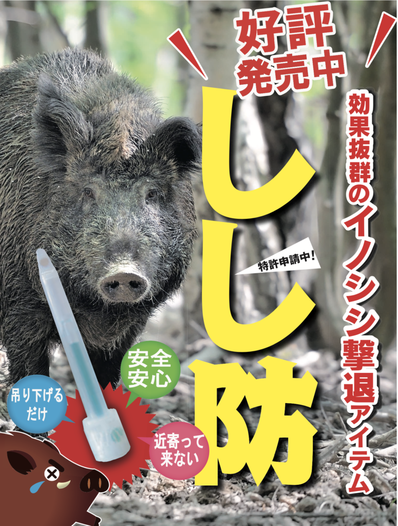 せっかく育てた作物がイノシシ(猪)の食害にあったり イノシシ(猪)のせいで怖い思いをしていませんか? ”しし防”は、設置の手軽さと、高い安全性を兼ね備えた、 注目度NO.1の忌避材です!!